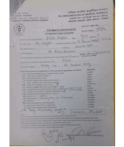 As per his treatment, Parivartan Social Sandesh Foundation would like to requests you to please help Disha Shukla, so he can fight with Eye Cancer.